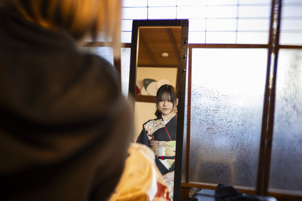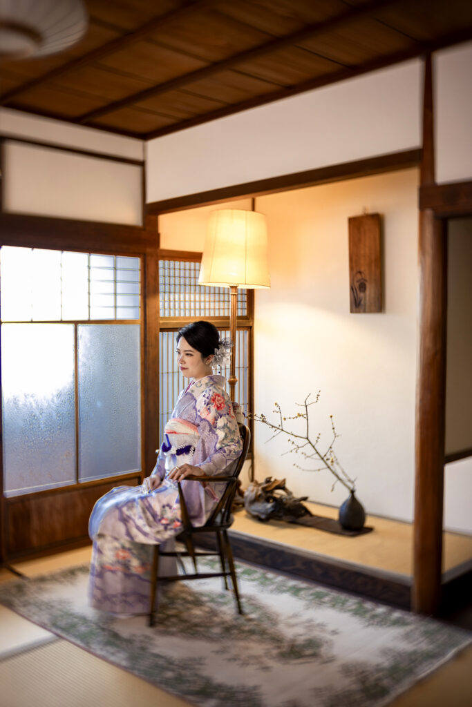 大阪桜ノ宮に建つ築100年の古民家アトリエでの着物撮影プランになります。明るい白壁の洋室や床の間のある落ち着いた雰囲気の和室は着物にぴったりのロケーションです。着物に合わせたブーケやヘッドパーツもご注文いただけます。  着物の型つけ(撮影するときに袖や裾を綺麗に整えます) に女性がアシスタントさせていただきます。